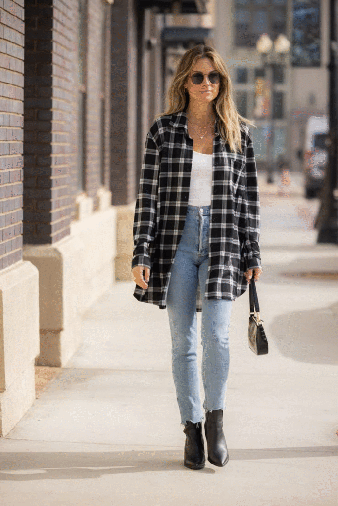 Ankle boots or sneakers work well with this combo. Tie the shirt around the waist if it gets warm or to change the look during the day. Plaid shirts can be thrifted cheaply and still look great.