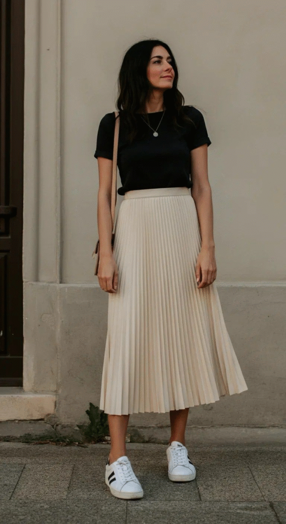 Flats or short boots keep the look practical for walking. Tuck the top in for a cleaner shape, or let it hang loose for comfort. Use a belt to change the outfit’s style. Wash the skirt on a gentle cycle and air dry to keep the fabric in good shape. Add a small neck layer for variety. Keep it simple.