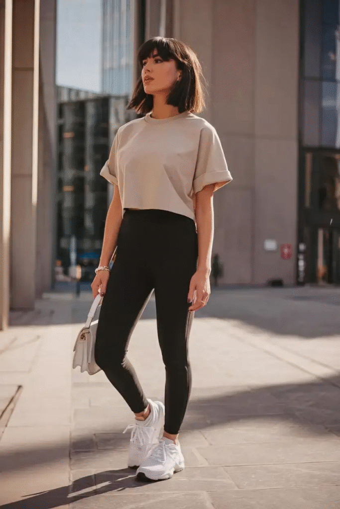 A minimal sporty look uses a crewneck sweatshirt and slim joggers for comfort and clean style. This look works for long school days and gym class. Sporty fabrics dry quickly and keep you comfy during active times.