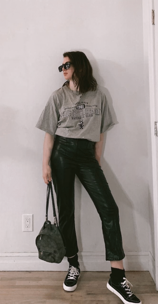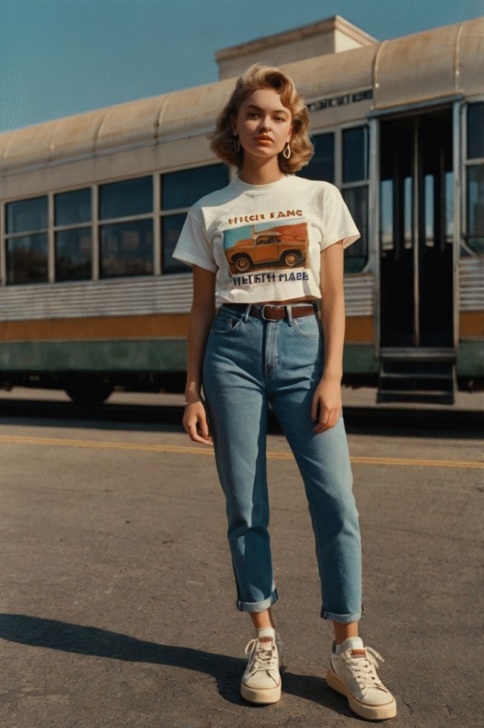 A retro throwback outfit blends high-rise jeans, a band tee, and chunky sneakers for a vintage feel. Look for tees with simple logos or band names; old band shirts are often thrifted at low cost.