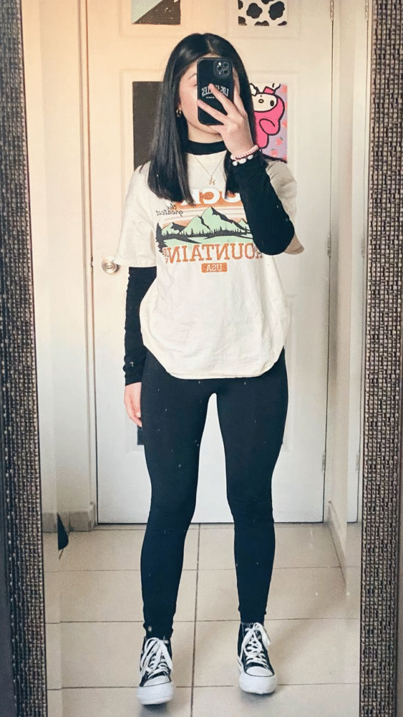 Put on a graphic tee. Add a leather jacket over it. Wear black jeans and sneakers. The leather jacket gives a strong outer layer. This outfit is good for a night out with friends. If it is colder, wear a thin long sleeve under the tee. The black jeans match many tops. Keep simple shoes that you can walk in. If you have a hat, it can add to the style. The outfit is easy to mix and use again. Keep the jacket dry in rain.