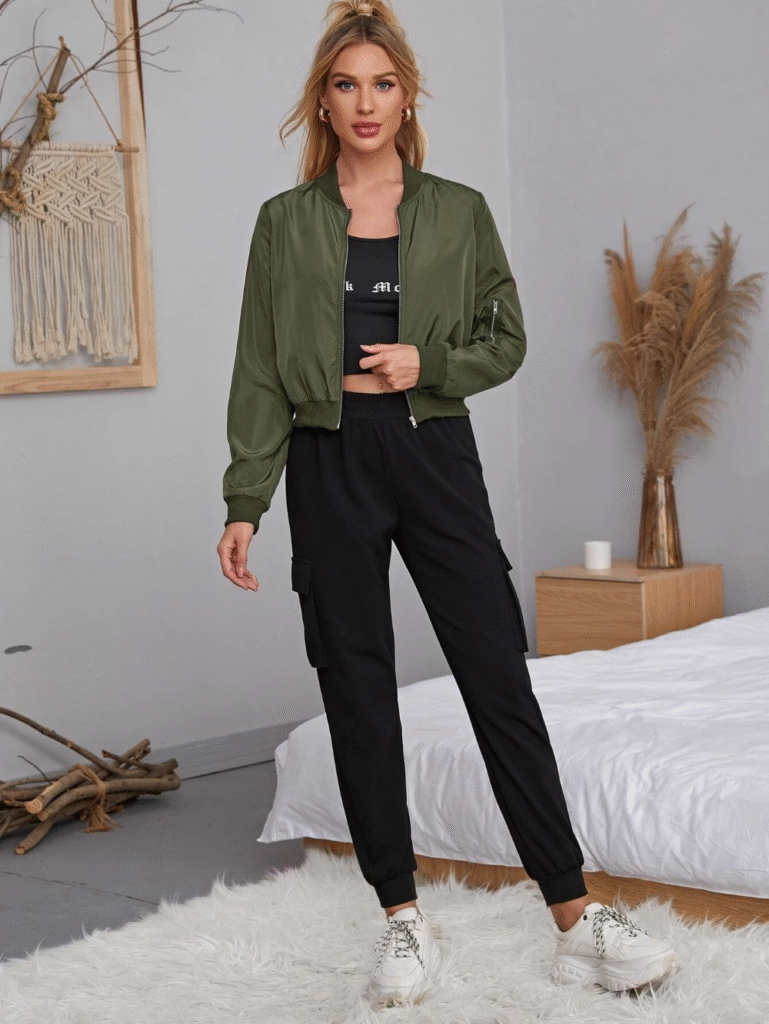 Wear a hoodie and put a bomber jacket on top. Use chinos for the bottom. Put on sneakers. The bomber jacket is short and fits at the waist. The hoodie adds warmth to the head and neck. Chinos are soft pants that match many tops. This outfit works for casual meet ups and school. Keep a cap in your bag for sun or light rain. If it is cold, add another thin layer under the hoodie. This outfit is easy to move in and looks ready for the day.