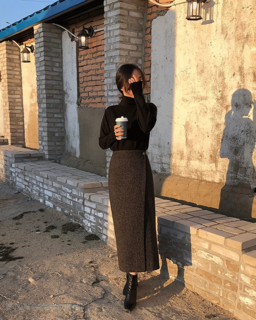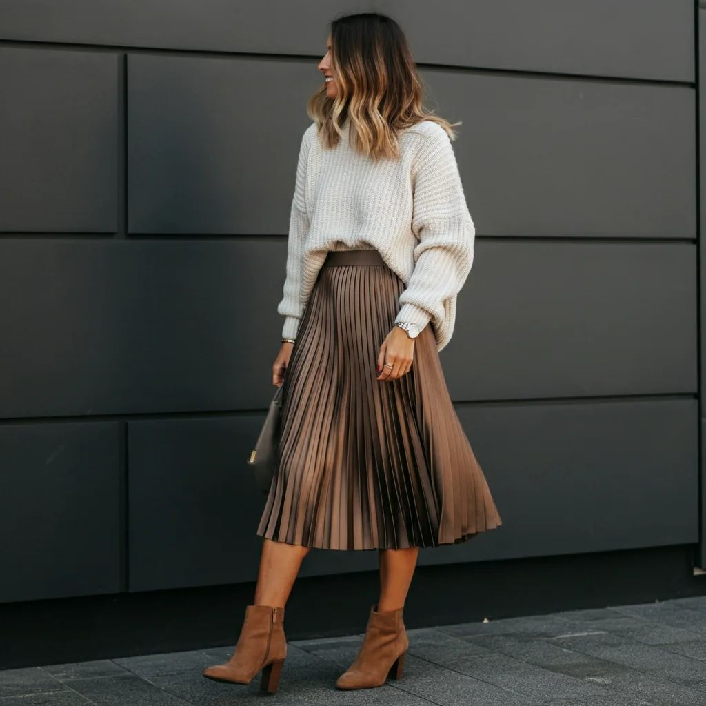 Put on a cable knit sweater and a pleated skirt. Add ankle boots on your feet. The skirt has small folds that move when you walk. The sweater keeps your top warm. Ankle boots protect your feet and match the skirt shape. This outfit is good for smart casual events or family outings. If you will walk a lot, wear tights under the skirt. Use a belt if you want to shape the waist. Carry a small bag for items you need. This outfit looks cared for and neat.