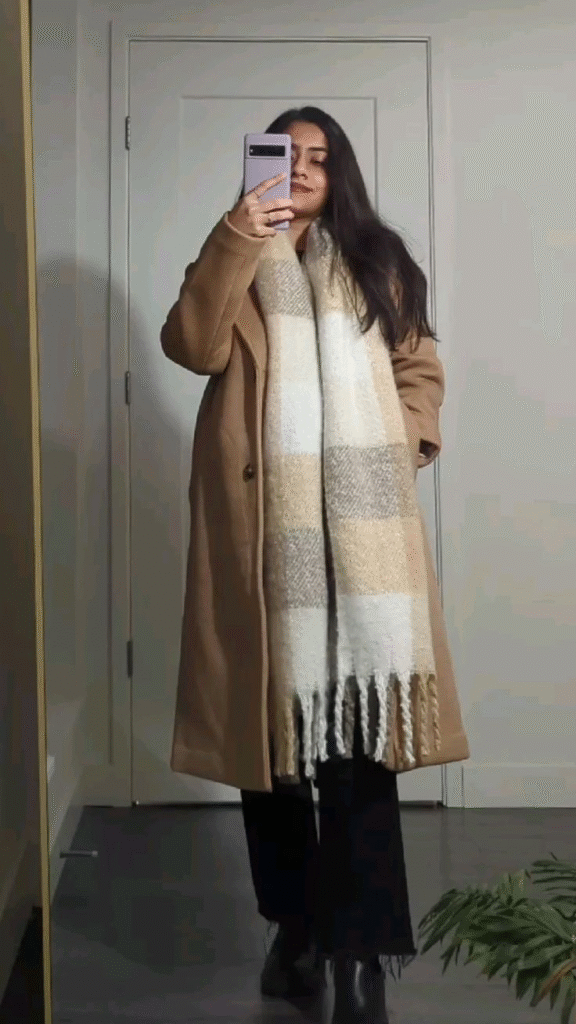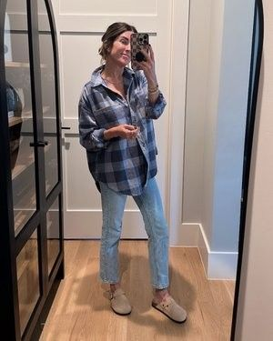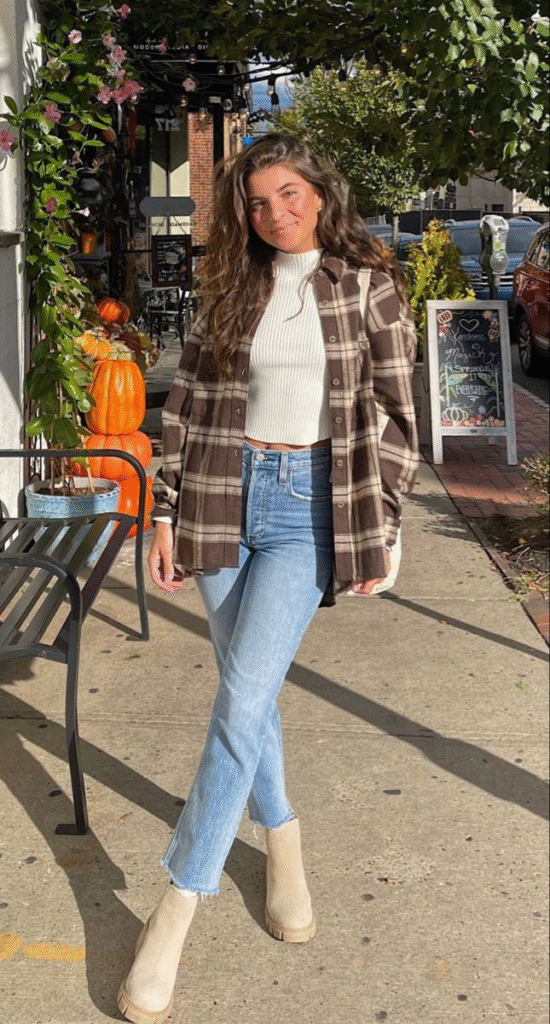 Wear a shacket, which is a shirt that works like a jacket. Put on a tee under it and jeans. Add boots to finish. The shacket is a light layer that can be worn inside or outside. It has buttons and looks like a shirt and jacket combined. Jeans keep your legs covered and work for many days. Boots protect your feet if the ground is wet. This outfit is an easy choice when you want a planned look without many layers. Keep a beanie for style and warmth.