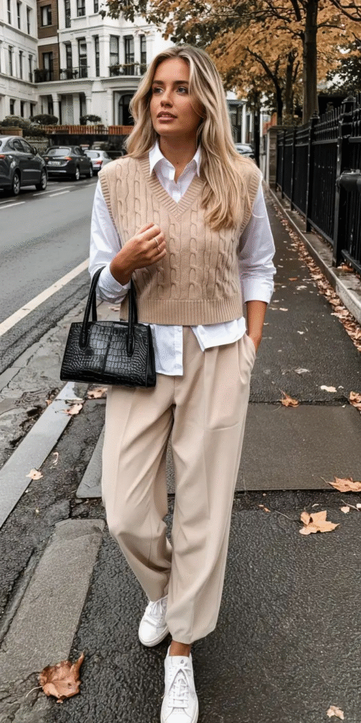 Wear a button-down shirt and a sweater vest over it. Add tailored pants and oxfords. The sweater vest covers the chest but leaves the arms free. Tailored pants fit well and look neat. Oxfords are flat shoes that match a tidy look. This outfit is good for school events or a simple office. Keep the shirt collar neat and tuck the shirt into the pants. Carry a folder or small book bag if you need papers. This set looks smart and works in many places.