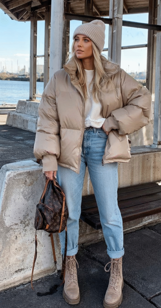 19. Puffer Jacket + Knit Hat + Warm Boots