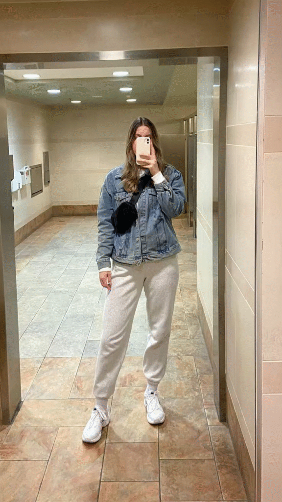 Use a hoodie as the middle layer. Put a denim jacket over the hoodie. Wear joggers for comfort. Put on sneakers for walking. This outfit is good for travel or a quick trip. The denim jacket adds a bit of structure. The hoodie keeps your head and neck warm. Joggers make it easy to run or play. If it rains, the denim jacket may get wet, so bring a rain layer. This outfit mixes comfort and style. Keep a cap or beanie to cover your head if it is cold.