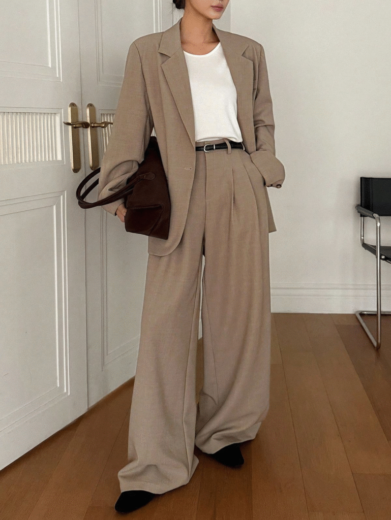Pick a plain tee and straight pants. Add a blazer on top. Wear loafers or plain shoes. The blazer makes the outfit look a bit more formal. This is good for a casual office or a meeting. Roll the sleeves of the blazer a bit for a relaxed look. Keep the tee tucked in at the front for neatness. Use a small bag or folder for papers when you go to work. This outfit is simple and works for many places. Choose colors that match so the outfit looks put together.