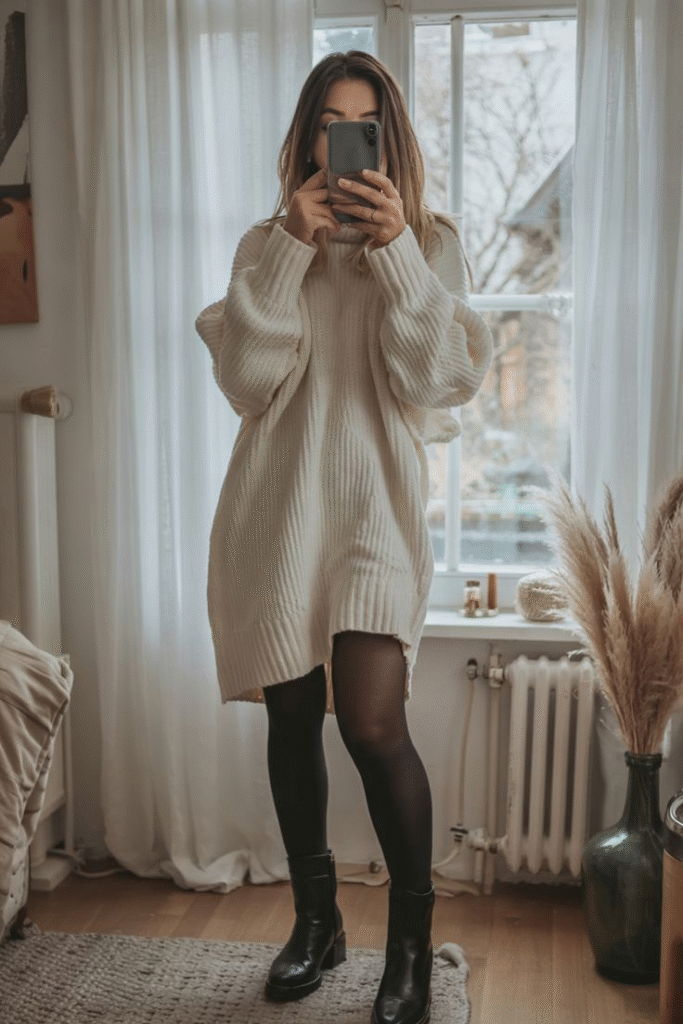 Pick a sweater dress and pull it on. Add tights under the dress to cover your legs. Put on Chelsea boots or short boots. This outfit is easy to wear and quick to pick. Use a belt if you want a waist shape. Tights help when the weather is cool and keep your legs covered. Chelsea boots are easy to pull on and off. This set is good for school or a walk. Carry a small bag for your things. You can add a thin jacket if it is colder outside.
