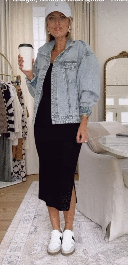 Put on a hoodie dress and low sneakers. Add a denim jacket if it gets cold. The hoodie dress is a one piece that is easy to wear. Sneakers keep your feet comfy for walking. The denim jacket gives an extra layer and can be taken off if it warms up. This outfit works for a quick trip or shopping day. Use a crossbody bag to keep items close. If it rains, a light rain cover will help. This set is an easy go-to outfit for fall.