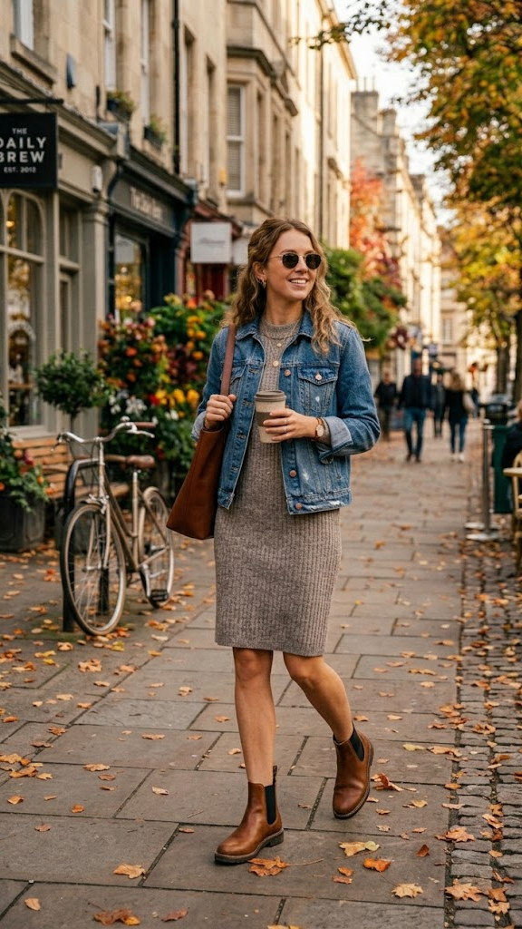A simple knit dress is super comfortable, and adding a denim jacket keeps it casual.