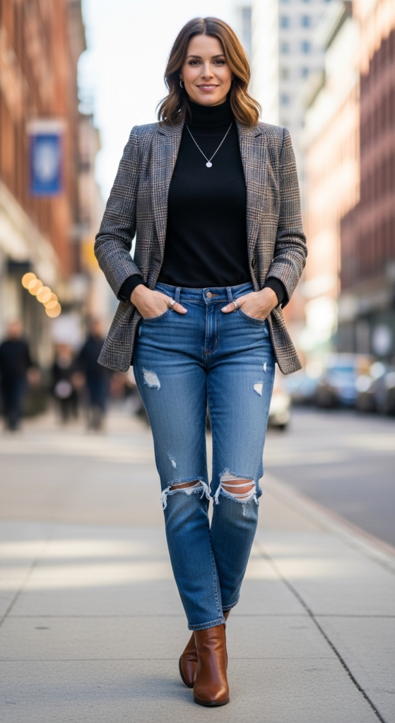 A fitted turtleneck with a blazer instantly upgrades your look.