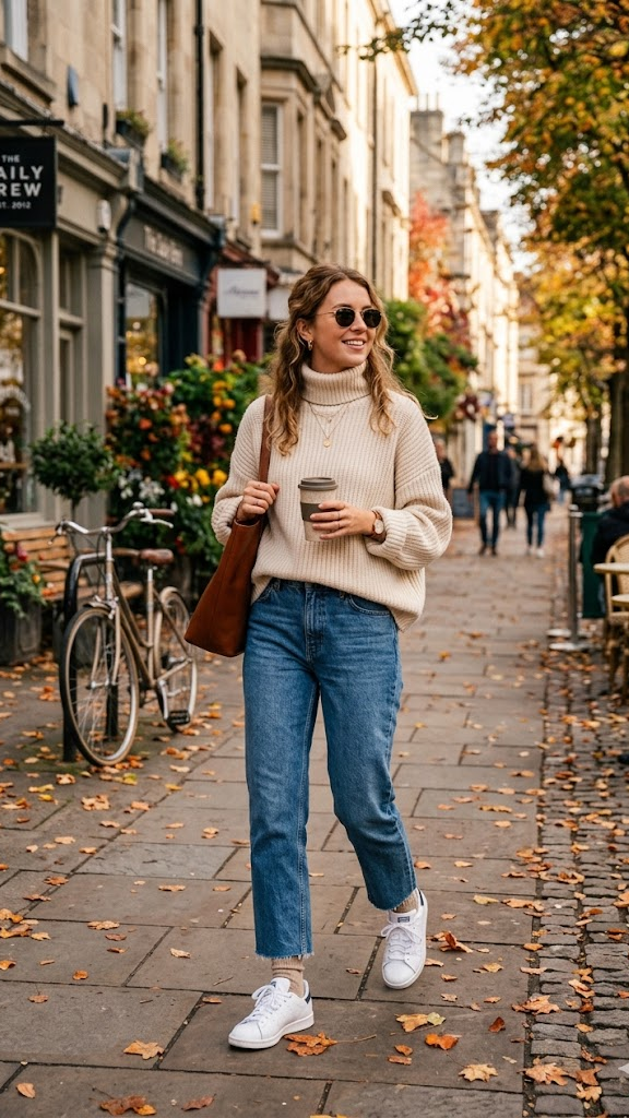 An oversized sweater instantly gives cozy vibes, and straight-leg jeans balance it out. Add white sneakers, and you’re done.