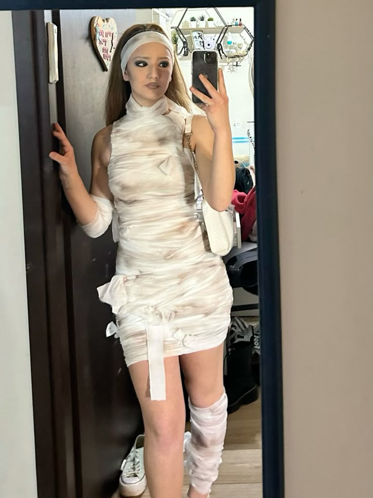 Wrap a person in strips of white fabric or use a roll of gauze instead of toilet paper for a sturdier look. Wrap loosely so the wearer can move and bend without strain. Use pins or tape to keep the strips in place near the waist instead of wrapping the face. Add light gray or brown paint to clothes to make them look old and dusty.