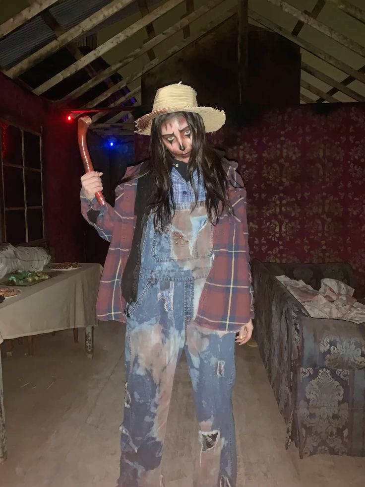 Wear a plaid shirt and jeans or overalls with a soft hat to make a field look. Tuck small pieces of raffia or straw into sleeves and collar for the scarecrow effect, but keep it away from flames and open candles.
