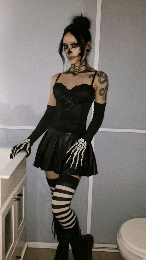 Put on black clothes and paint simple white bones using fabric paint or tape. Use a printed template to make the bone shapes faster and more even. Add glow-in-the-dark paint to the bones so the outfit shows up at night on walks. Place reflective tape near the hem or on the back to stay visible to drivers.