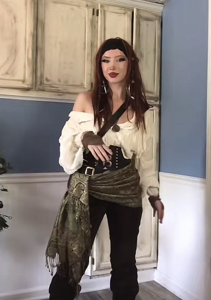 Wear a loose white shirt, dark vest, and a bandana tied around the head to make a pirate look. Make an eye patch from black felt and attach elastic so it stays in place. Use a belt and a light scarf as a sash around the waist. Make a toy sword from cardboard and tape so it is light and safe.