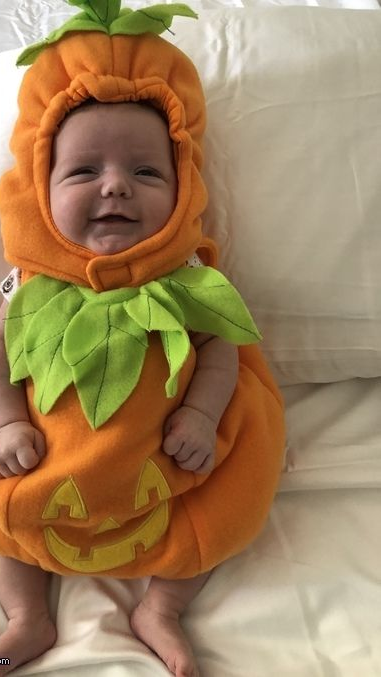 Use an orange onesie or soft shirt and add felt cutouts for a pumpkin face. Sew or glue pieces with fabric glue and avoid tight fits or heavy decorations that can bother a baby. Use a soft green hat or headband for the stem, and keep the outfit warm for cool evenings.