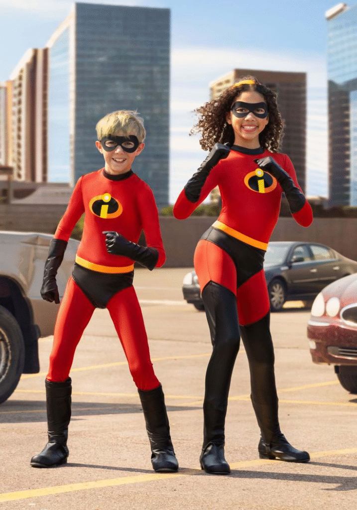 Dress one child in the main color and another in a smaller, matching color to make the hero and sidekick set. Use felt to cut simple emblems and glue them to shirts. Tie light capes at the shoulders and keep them short to avoid tripping.