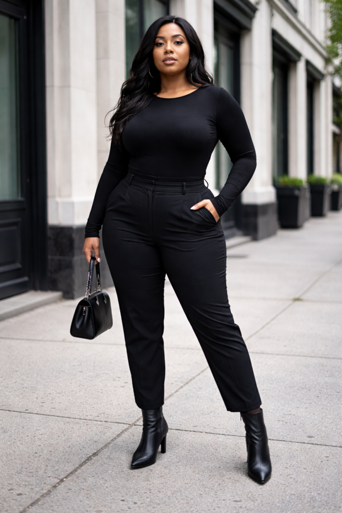 4. All-Black Top + Black Pants + Black Boots (Sleek Monochrome Fit)