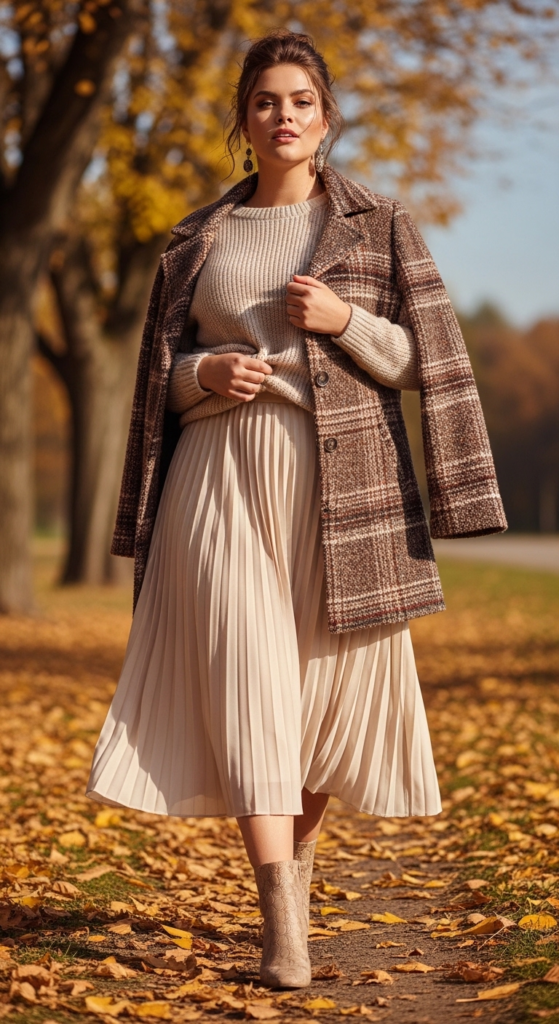 Fall fashion in the U.S. is all about layers and textures. A pleated midi skirt adds movement, while a cozy sweater balances it with warmth.
